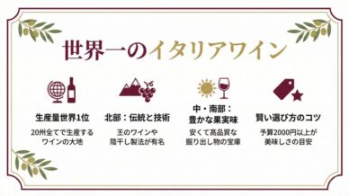 地方の特徴 イタリアワインの特徴とは?おすすめワインも紹介! ワインと言えばフランスというイメージが強いですが、実はイタリアの方が生産量も多く、歴史も古いです。それぞれに特徴がありますが、ワインビギナーにオススメするという観点では、価格や味わい的に、イタリアワインの方がオススメできるものが多いです。今回はイタリアワインの全体像をつかむため、ざっくりとまとめて解説します。 地方の特徴学ぶ