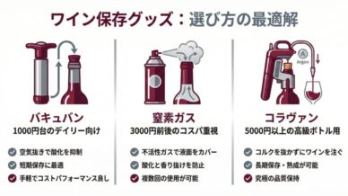 ワインライフ 初心者はどんなワインの保管グッズを準備すれば良い?コラヴァンの効果は? ワインは開封するとどんどん味が変わっていきます。これを防ぐためには酸素を遮断する必要がありますが、そのためのアイテムとしてバキュバン・窒素ガス・コラヴァンなどが販売されています。それぞれの効果や持続期間について、実体験をもとに解説します。具体的な例として、各アイテムを使用するケースについても例示してご紹介します。 ワインライフ