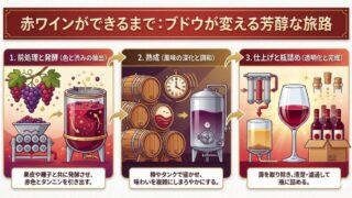 なお、赤ワイン・白ワインの作り方をさらに詳しく知りたい人や、作り方の特徴をあらわしたワインを知りたい人は以下も合わせてご覧ください。