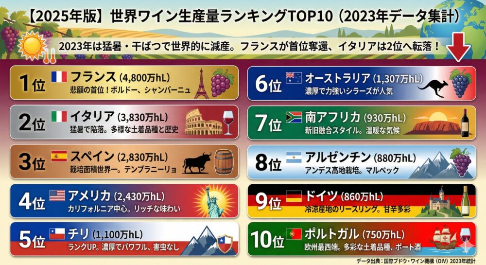 ワイン生産国のランキングは、国際ブドウ・ワイン機構(OIV)が発表した2023年の統計に基づいています。(2024年のデータはまだ集計中です。)